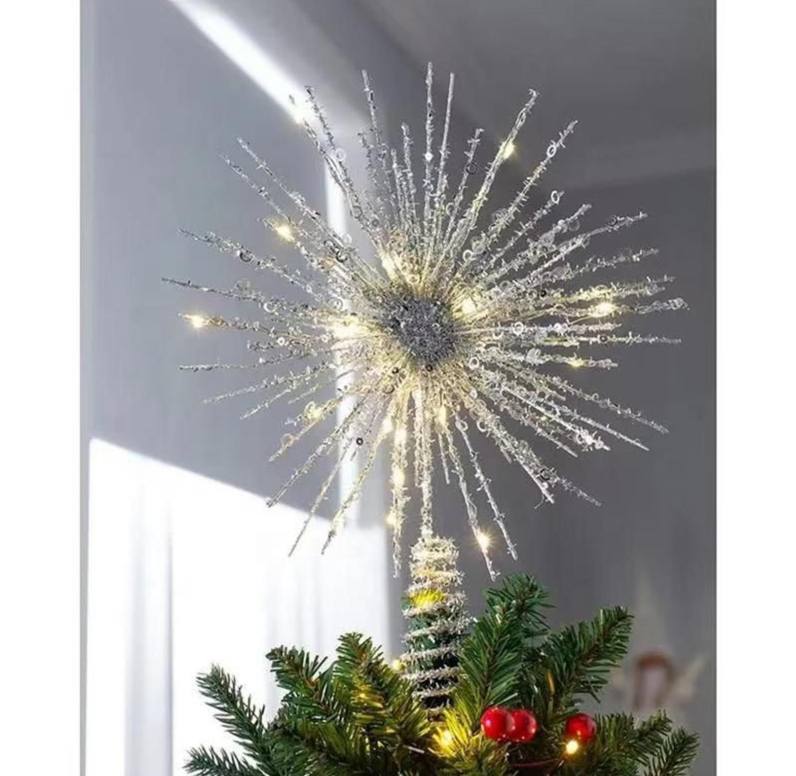 Add the perfect, luminous finishing touch to your Christmas centerpiece with the stunning Celestial Starburst LED Tree Topper. This show-stopping accent features a dimensional, starburst design composed of dozens of acrylic rods that radiate outward, each tip delicately coated with shimmering silver glitter. Integrated warm LED lights are seamlessly embedded throughout the design, creating a breathtaking, soft internal glow that highlights the sparkling texture. The topper sits securely atop the highest branch, projecting a festive light that illuminates the entire tree. Its modern yet elegant aesthetic makes it an ideal complement to themes ranging from frosty white winter wonderlands to sophisticated silver and gold displays, ensuring your tree shines brilliantly from every angle.