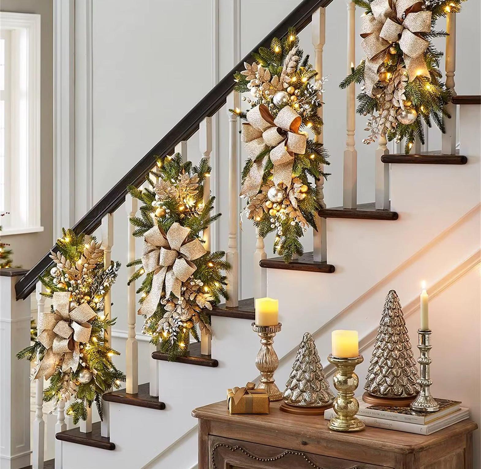 Achieve an air of refined, warm luxury in your home with the exquisite Golden Hearth Pre-Lit Christmas Swag. This high-quality vertical accent is built upon a full, realistic pine base and richly embellished with a dazzling array of sophisticated metallic elements, predominantly in shades of Gold and Champagne. The arrangement features beautifully detailed faux foliage, shimmering gold-dusted pinecones and leaves, and elegant champagne baubles for a coordinated, opulent look. The focal point of each swag is a magnificent, multi-layered bow crafted from wide, textured gold ribbon, adding substantial volume and high-end appeal. Integrated with warm, energy-efficient LED lights, these durable pieces are perfect for hanging vertically along staircase banisters, framing a console table, or accenting a doorway, instantly creating a cohesive, luminous, and dramatically festive setting.