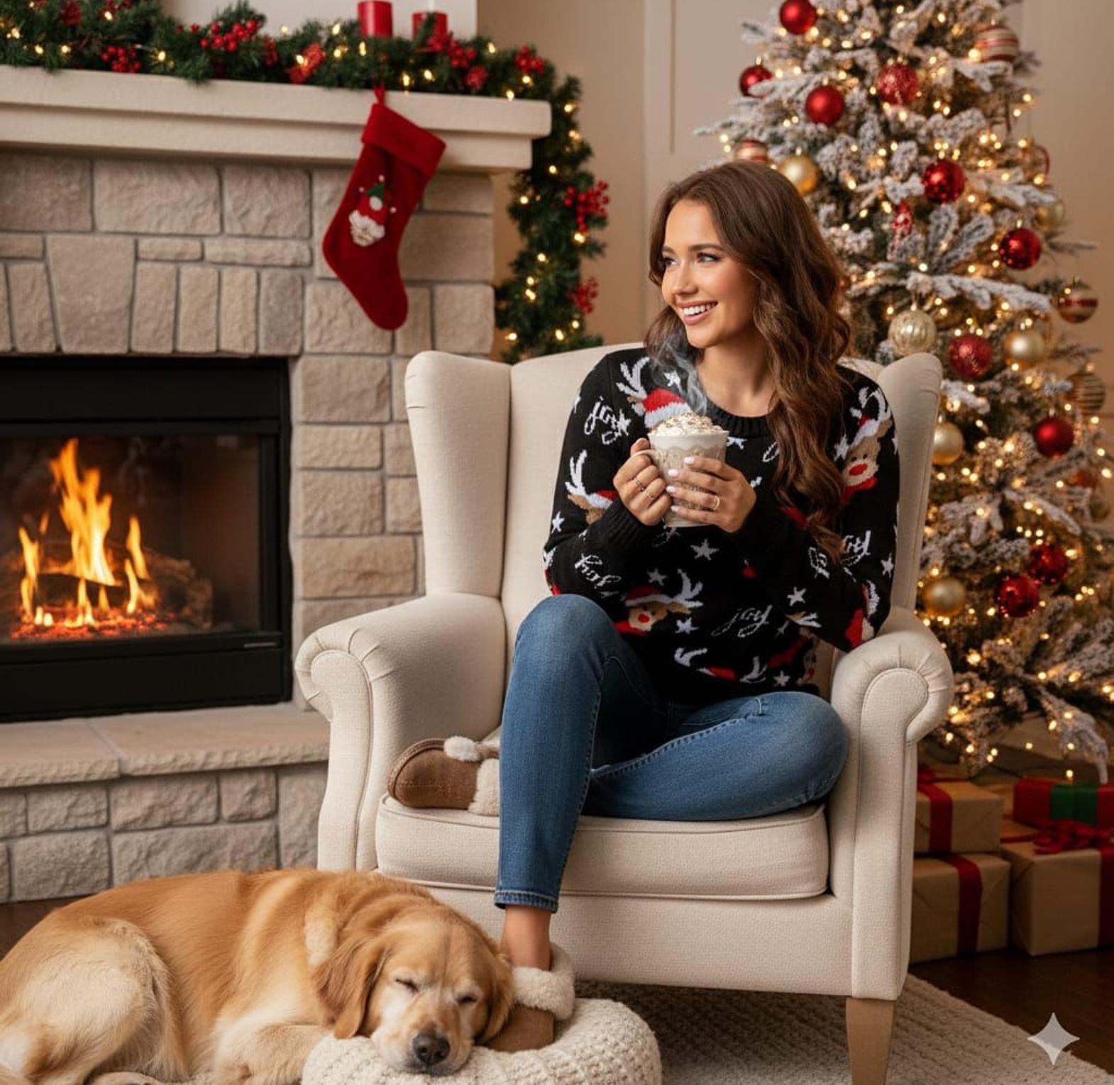 Embrace the spirit of the season with the delightful Holly Jolly Reindeer & Joy Knit Sweater, your essential piece for festive comfort and style. This high-quality, long-sleeved sweater is crafted from a soft, warm knit blend that ensures you stay perfectly snug whether you are at a family gathering or simply snuggling up at home. The deep Black base is beautifully contrasted by an eye-catching, repeating holiday pattern featuring charming reindeer adorned with Santa hats, cheerful stars, and the message "Joy" woven into the design. Its flattering crew neck and relaxed fit make it easy to wear and pair with jeans or leggings, ensuring you are comfortable, charming, and absolutely photo-ready for all your holiday moments. This versatile and fun piece is designed to be a durable, stylish staple for your entire winter wardrobe.