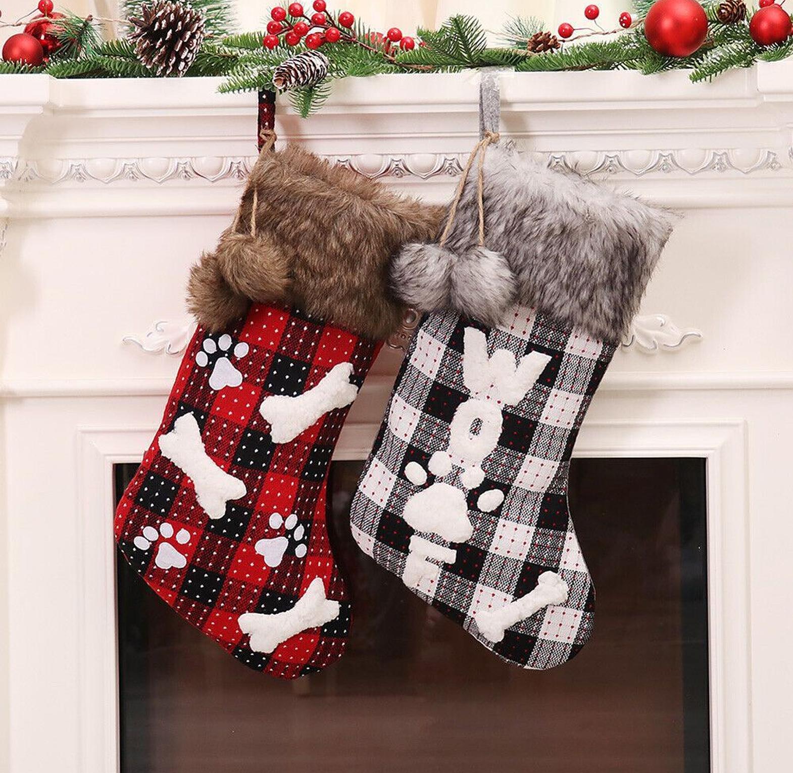 Ensure your beloved animals have a place for their holiday treats with the delightful Plaid Paws Pet Christmas Stocking Set. This pack includes two distinct 37 X17 cm stockings, each crafted from soft fabric featuring a classic buffalo plaid pattern, one in traditional Red and Black and the other in stylish Black and White. Both stockings are adorned with soft, plush white appliques of paw prints and dog bones, making them instantly recognizable for the family pet. The top edge is finished with a wonderfully soft, thick faux fur cuff (in brown and gray tones, respectively), which adds a touch of rustic luxury and warmth. Complete with a sturdy hanging loop, these stockings are built to hold plenty of goodies, making them a charming and essential part of your annual fireplace display.