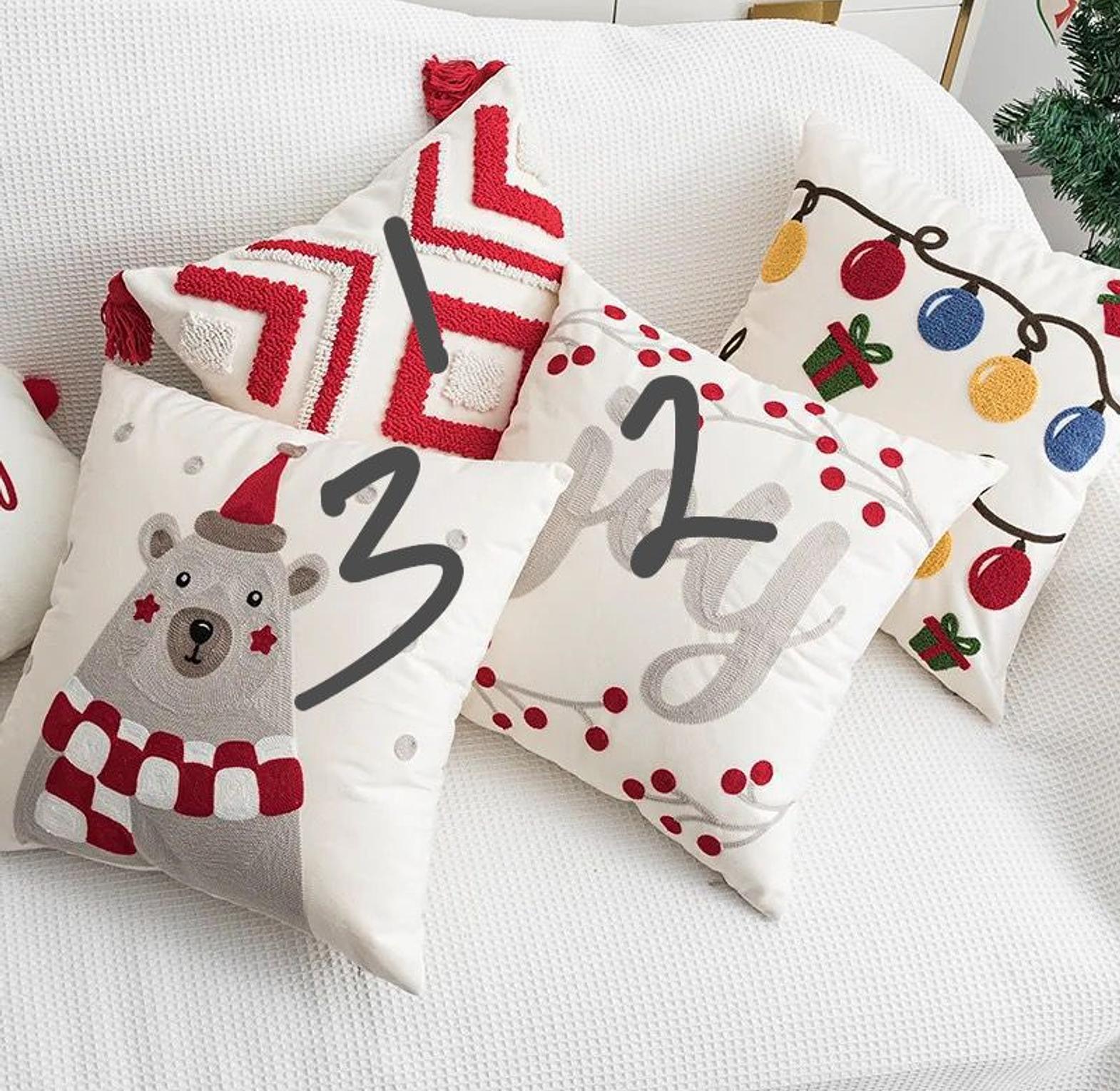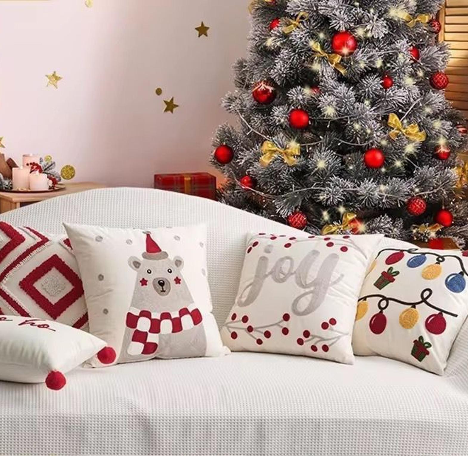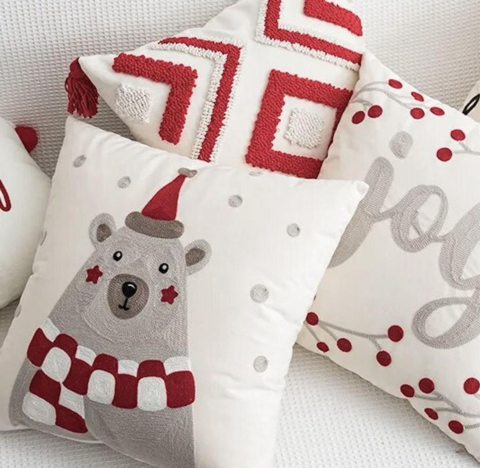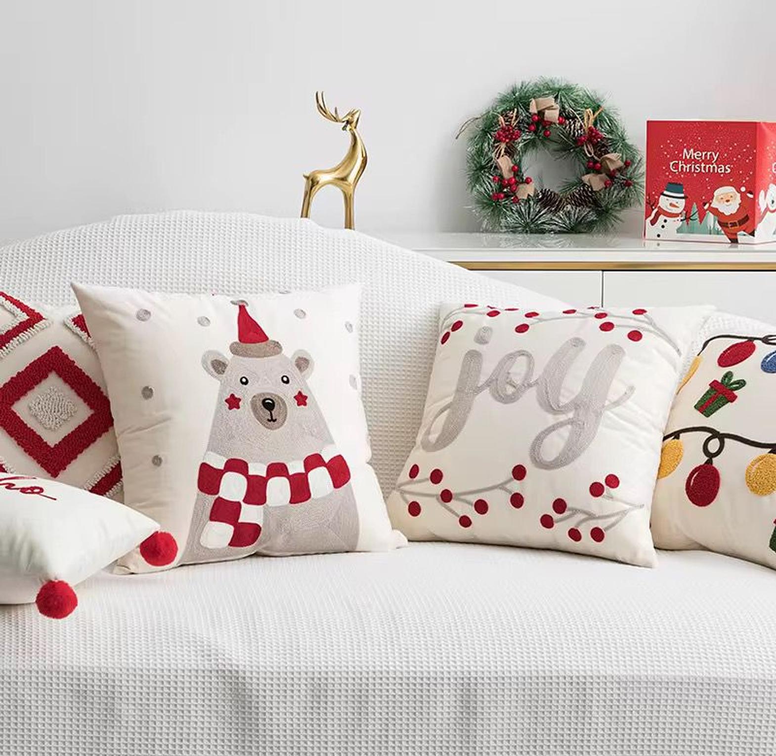 Liven up your seasonal space with the enchanting Whimsical Cheer Embroidered Holiday Cushion Cover Set. This collection features four unique, high-quality covers, each showcasing imaginative designs on a clean, bright White base. The festive spirit is captured through rich embroidery and tufting, primarily in classic Red alongside other cheerful holiday colors like gold, blue, and green. Motifs include a charming polar bear in a scarf, abstract patterns with tassels, a bold "Joy" design with berries, and a string of colorful lights. These covers offer a perfect blend of cozy, handcrafted texture and whimsical holiday imagery. They are a delightful and simple way to refresh your existing décor, ensuring your pillows are both inviting and perfectly styled for the Christmas season.
