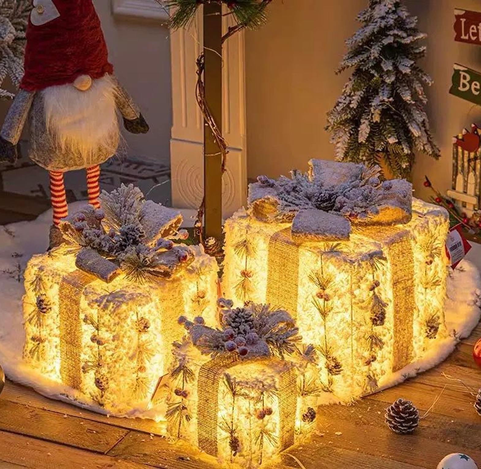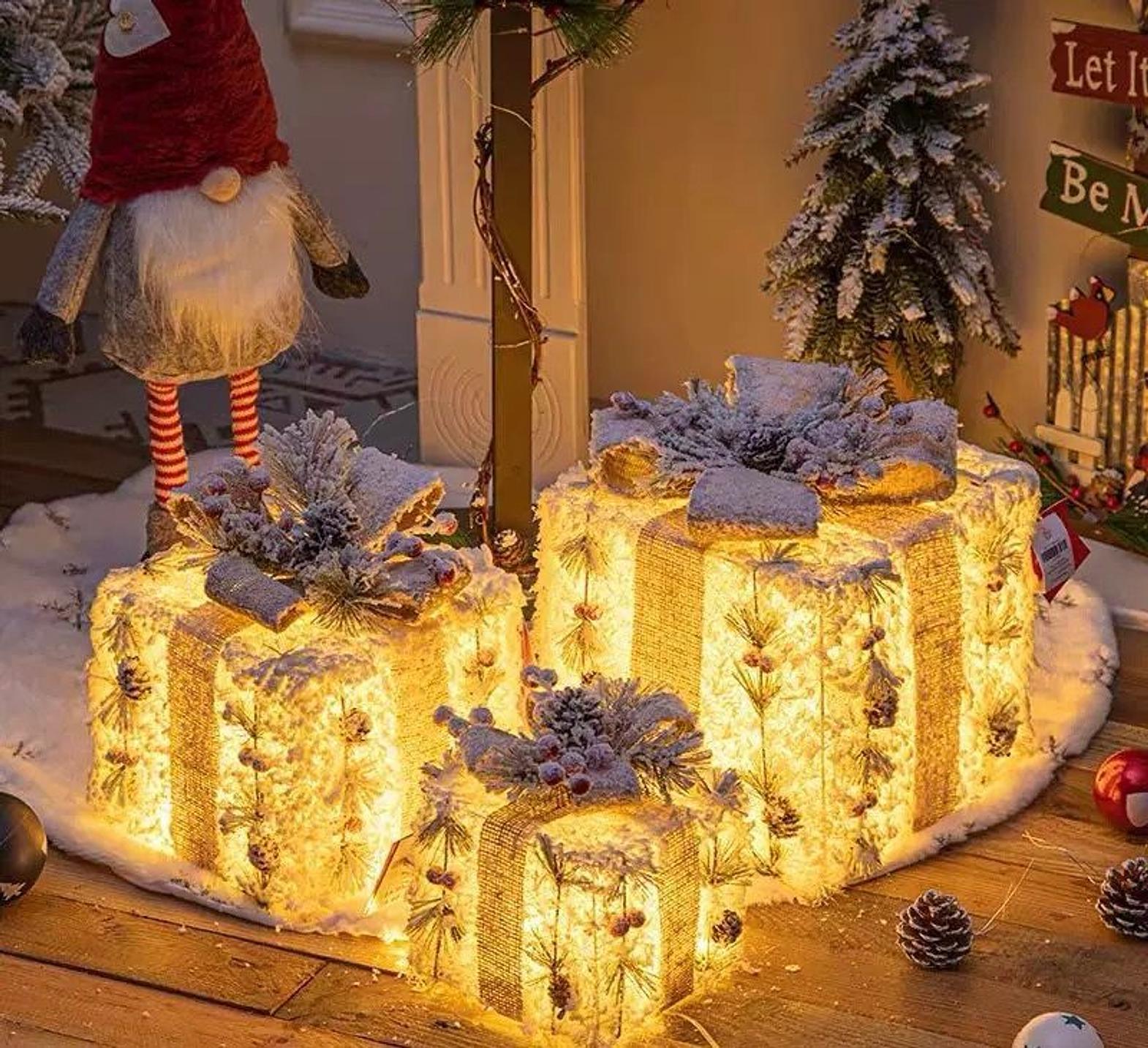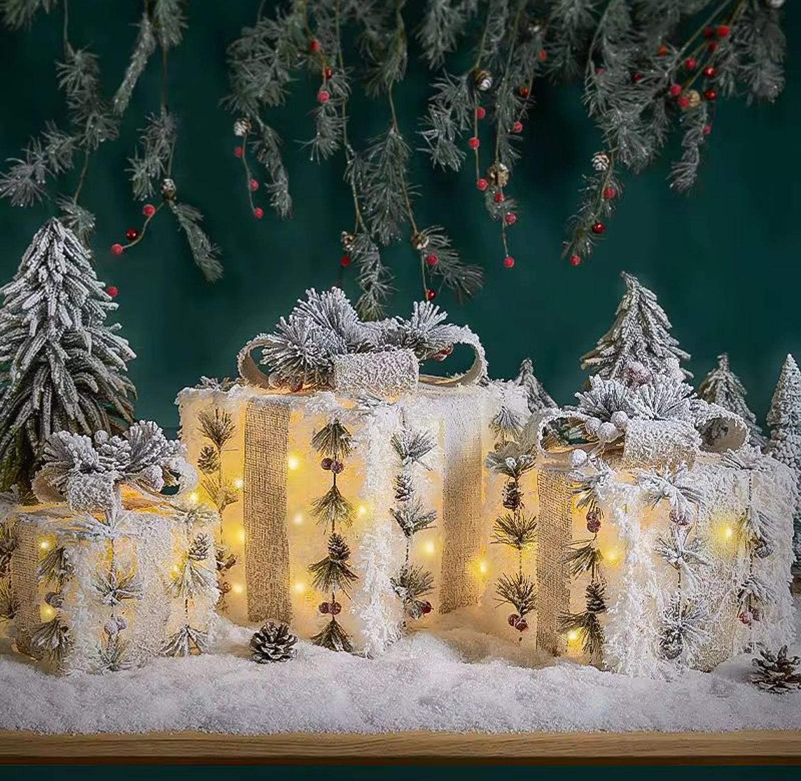 Create a magical, rustic-chic scene with the Winter Village Snow Flocked Lighted Gift Box Set. This collection includes three graduated sizes of decorative boxes, designed to stack attractively or spread throughout a space. Each box is covered in a beautiful burlap-style fabric, giving them a handcrafted, natural look that is perfect for a farmhouse or cabin theme. The edges and ribbon accents are artfully detailed with a soft white flocking and faux evergreen touches, resembling gifts left out in the snow. They come equipped with internal warm lights, which emit a gentle, inviting glow that enhances the holiday atmosphere. Placed under the Christmas tree, on a mantel, or near an entryway, these durable, eye-catching boxes provide an instant, sophisticated touch of light and texture to your holiday décor.