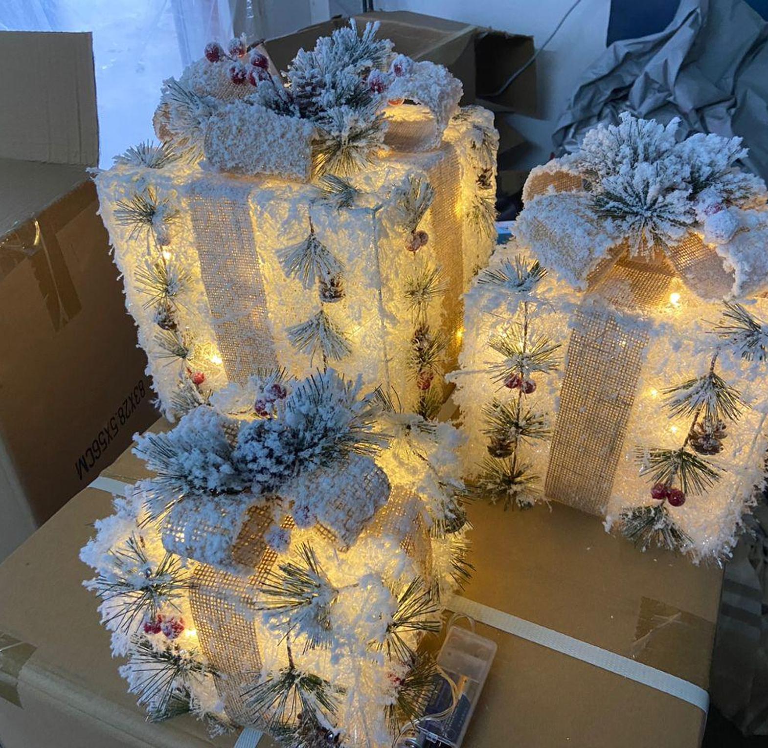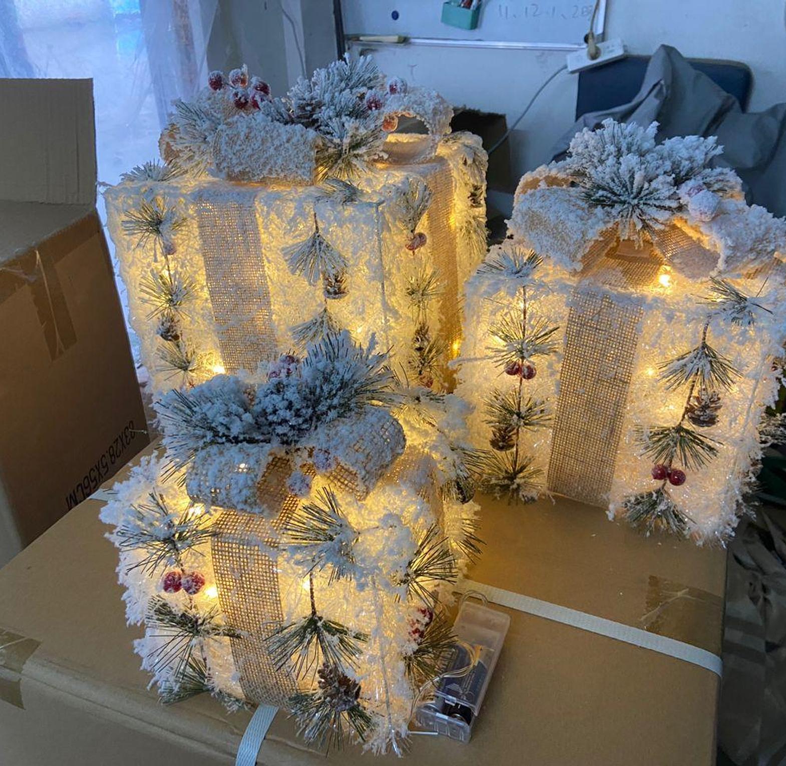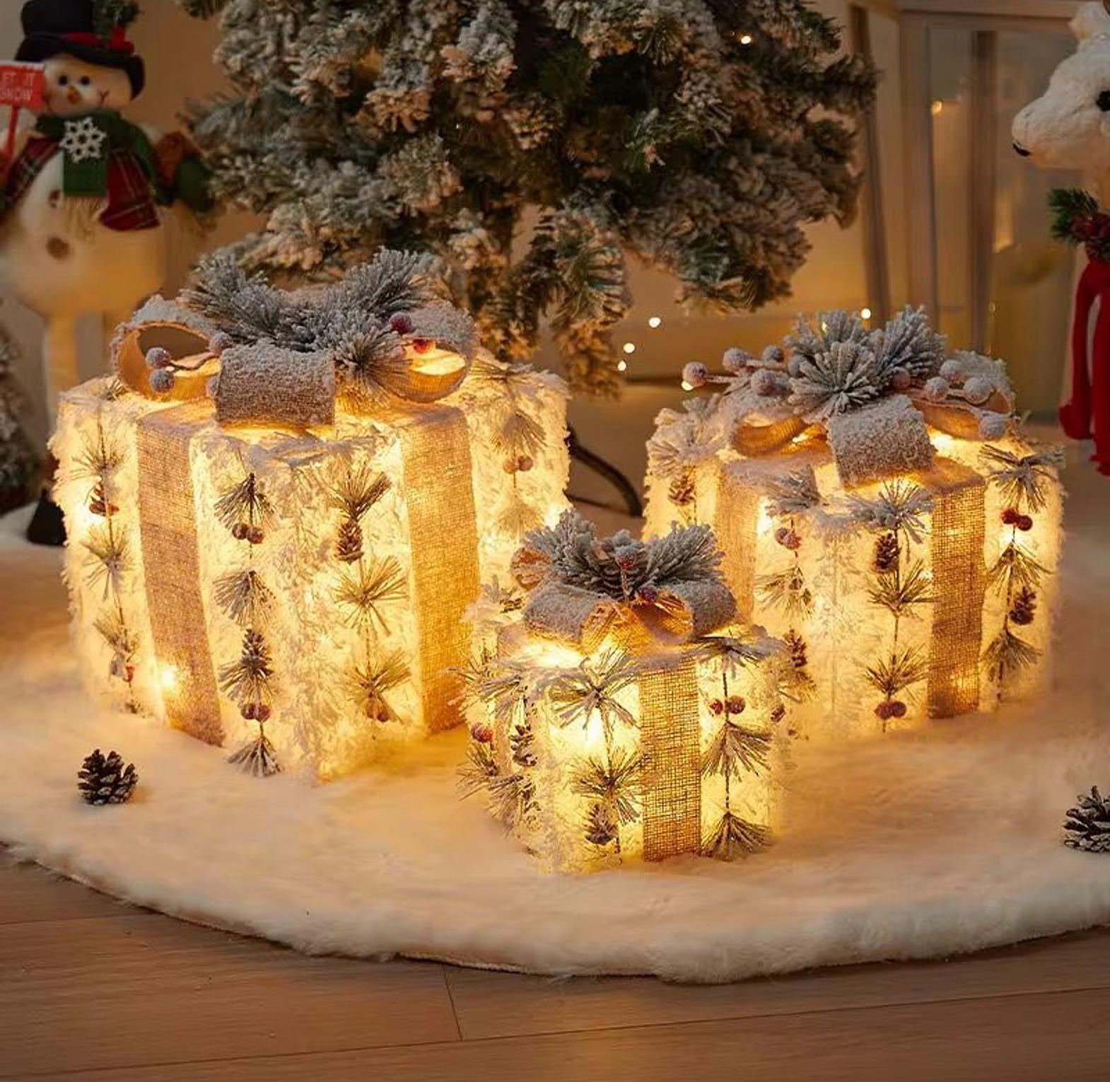 Create a magical, rustic-chic scene with the Winter Village Snow Flocked Lighted Gift Box Set. This collection includes three graduated sizes of decorative boxes, designed to stack attractively or spread throughout a space. Each box is covered in a beautiful burlap-style fabric, giving them a handcrafted, natural look that is perfect for a farmhouse or cabin theme. The edges and ribbon accents are artfully detailed with a soft white flocking and faux evergreen touches, resembling gifts left out in the snow. They come equipped with internal warm lights, which emit a gentle, inviting glow that enhances the holiday atmosphere. Placed under the Christmas tree, on a mantel, or near an entryway, these durable, eye-catching boxes provide an instant, sophisticated touch of light and texture to your holiday décor.