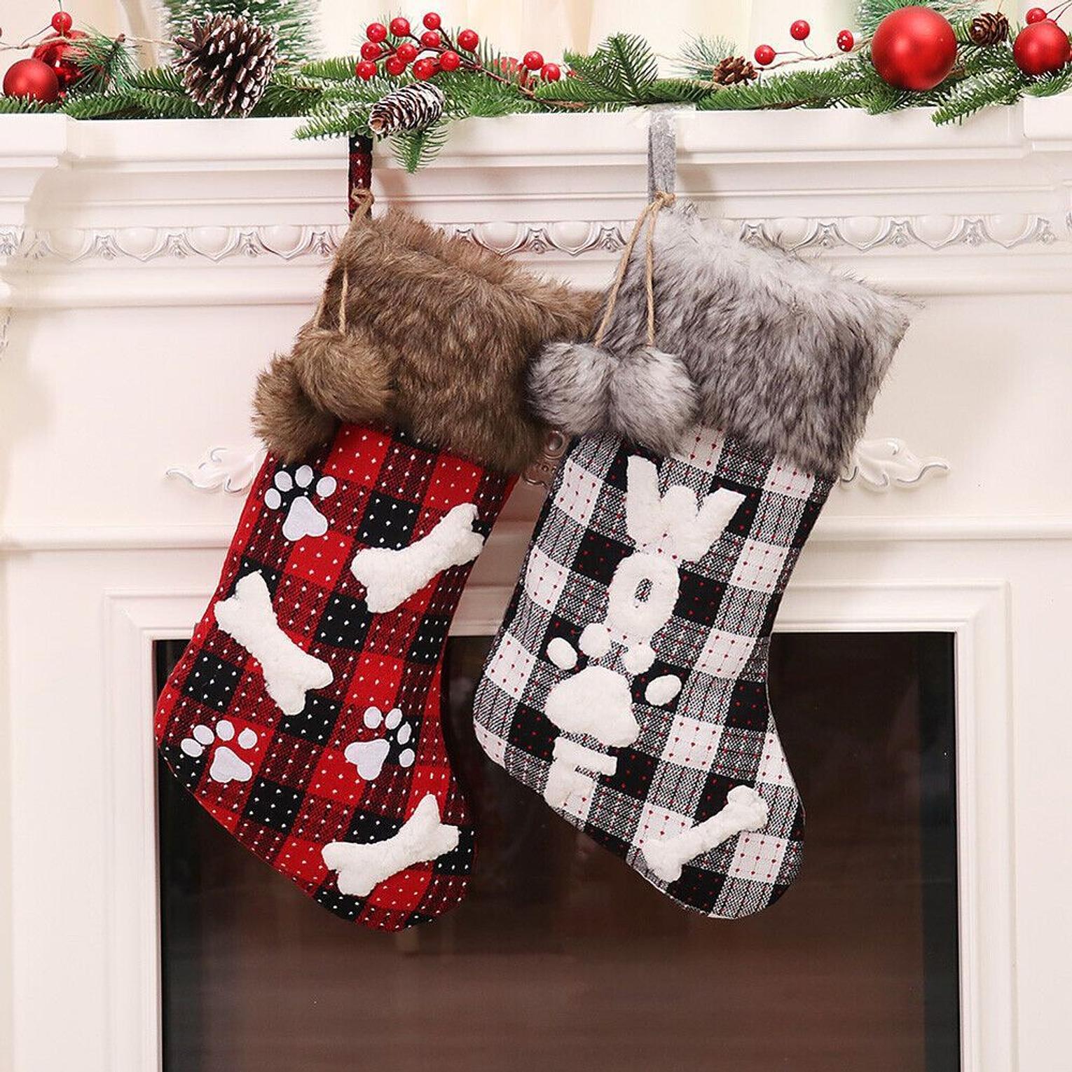 Ensure your beloved animals have a place for their holiday treats with the delightful Plaid Paws Pet Christmas Stocking Set. This pack includes two distinct 37 X17 cm stockings, each crafted from soft fabric featuring a classic buffalo plaid pattern, one in traditional Red and Black and the other in stylish Black and White. Both stockings are adorned with soft, plush white appliques of paw prints and dog bones, making them instantly recognizable for the family pet. The top edge is finished with a wonderfully soft, thick faux fur cuff (in brown and gray tones, respectively), which adds a touch of rustic luxury and warmth. Complete with a sturdy hanging loop, these stockings are built to hold plenty of goodies, making them a charming and essential part of your annual fireplace display.