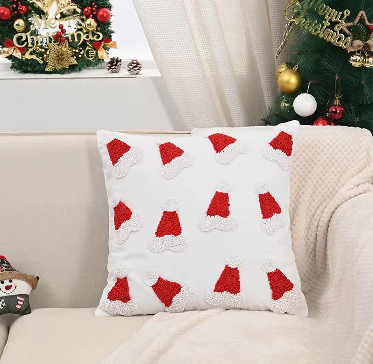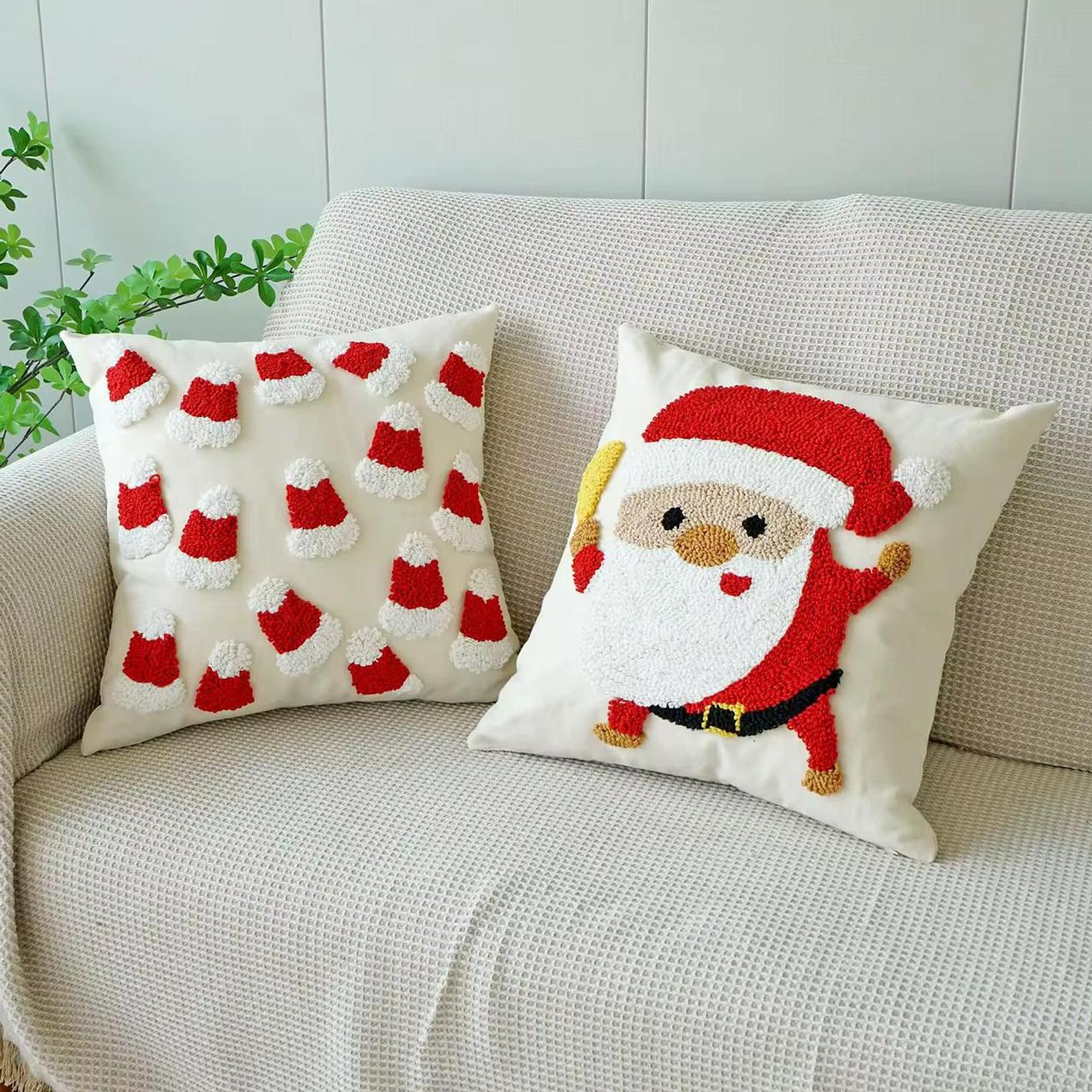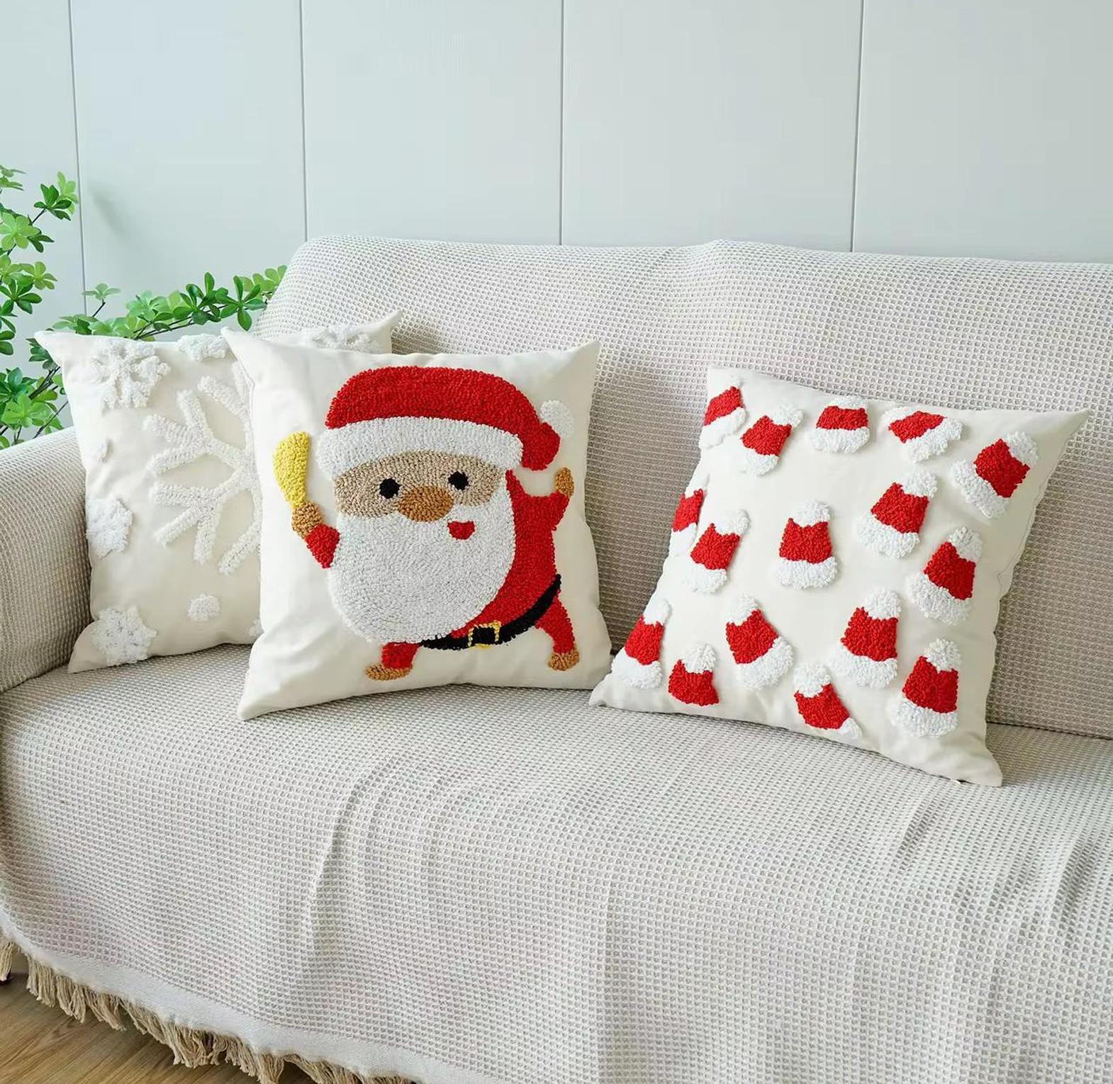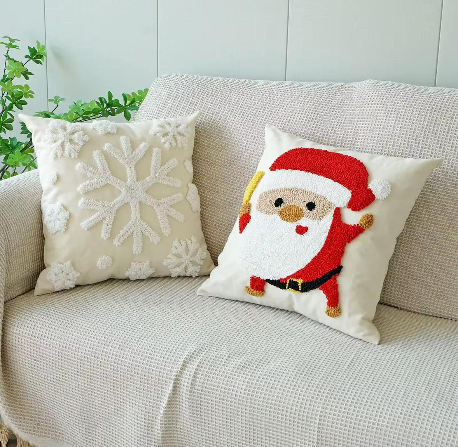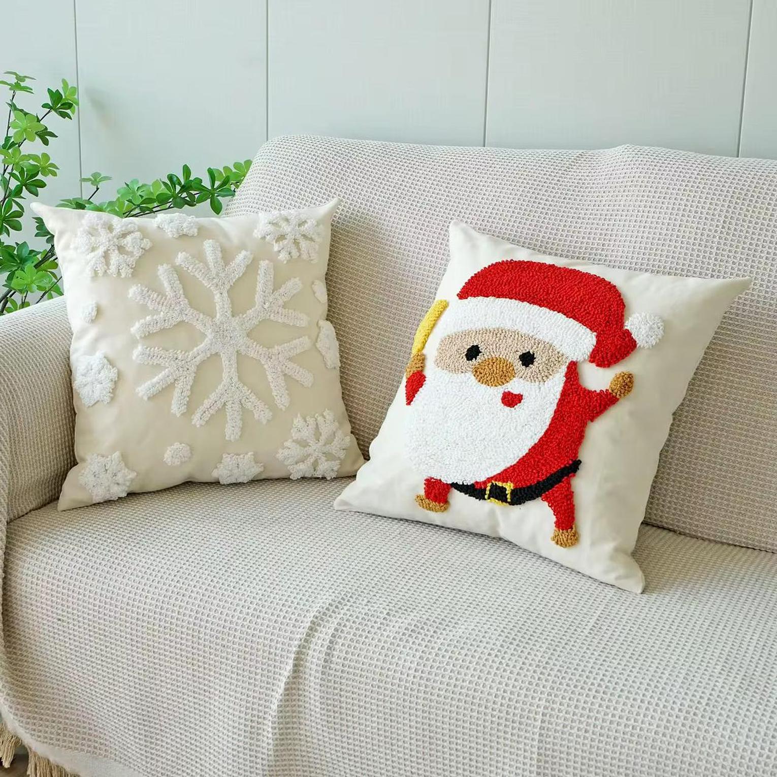 Add a playful, artisanal touch to your home with the premium Santa & Snowflake Pillow Cover Set. These Christmas quality throw pillow covers/cases use the popular punch needle technique, which creates a wonderful, soft, three-dimensional texture on the front panels. The set includes whimsical designs such as a lively Santa Claus figure and intricate snowflakes, available on a neutral background to make the festive red and white colors truly pop. Crafted for durability and style, these covers easily refresh your sofa, armchair, or bed, giving your space a sophisticated yet fun holiday makeover. They are an effortless way to achieve a warm, inviting atmosphere for all your seasonal gatherings.