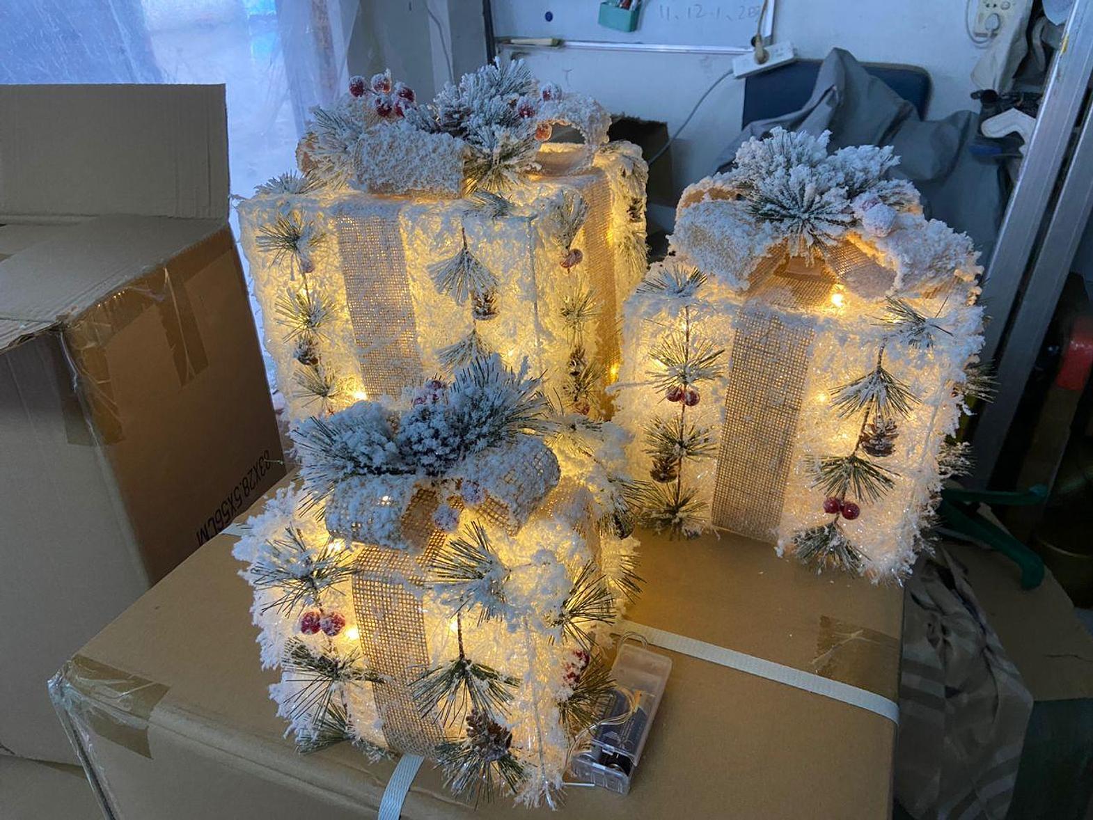 Create a magical, rustic-chic scene with the Winter Village Snow Flocked Lighted Gift Box Set. This collection includes three graduated sizes of decorative boxes, designed to stack attractively or spread throughout a space. Each box is covered in a beautiful burlap-style fabric, giving them a handcrafted, natural look that is perfect for a farmhouse or cabin theme. The edges and ribbon accents are artfully detailed with a soft white flocking and faux evergreen touches, resembling gifts left out in the snow. They come equipped with internal warm lights, which emit a gentle, inviting glow that enhances the holiday atmosphere. Placed under the Christmas tree, on a mantel, or near an entryway, these durable, eye-catching boxes provide an instant, sophisticated touch of light and texture to your holiday décor.